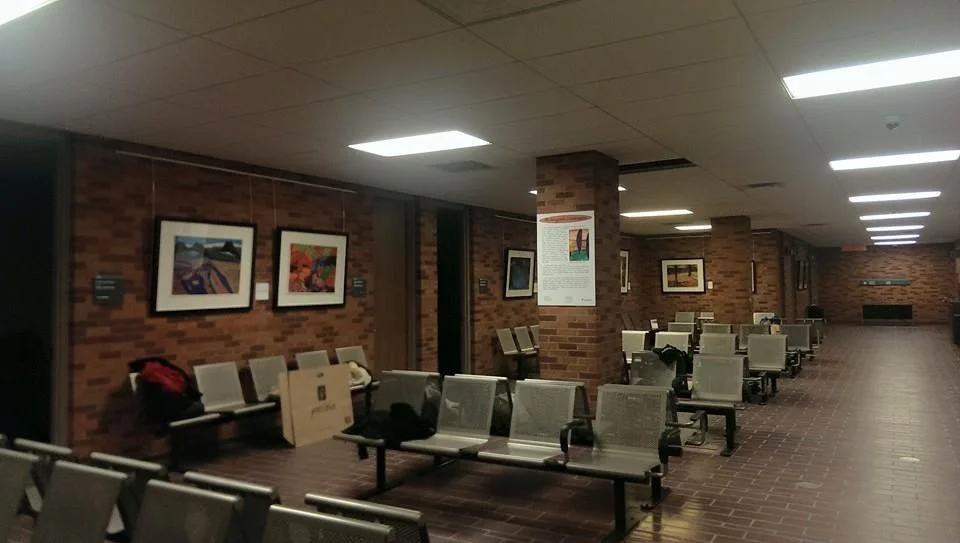 Re-Imagined Landscapes was a 2015 spring exhibition at the Barrie Courthouse in Ontario featuring artist Christina Luck, whose artwork created warmth and comfort in an otherwise unwelcoming space. This area of the courthouse was for the family court, and because there were so many children who had to be in the waiting room, colouring pages of Luck’s artwork and crayons were provided. I was part of the team that selected and framed the paintings and visited Luck at her studio for an interview.